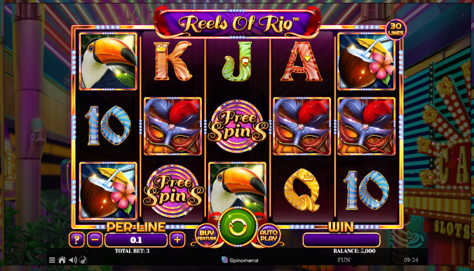 Reels of Rio de Spinomenal transporta a los jugadores a una fabulosa fiesta callejera llena de juerguistas, carrozas y escuelas de samba. Una banda sonora de samba dirigida por una trompeta de lo más divertida garantiza que los jugadores se diviertan mientras intentan encontrar una serie de símbolos que incluyen tucanes, máscaras, cócteles y tambores. Un glamuroso intérprete de samba representa el símbolo de comodín y si se encuentran cinco de ellos en una línea de pago ganadora, se devolverá x1000 la apuesta.